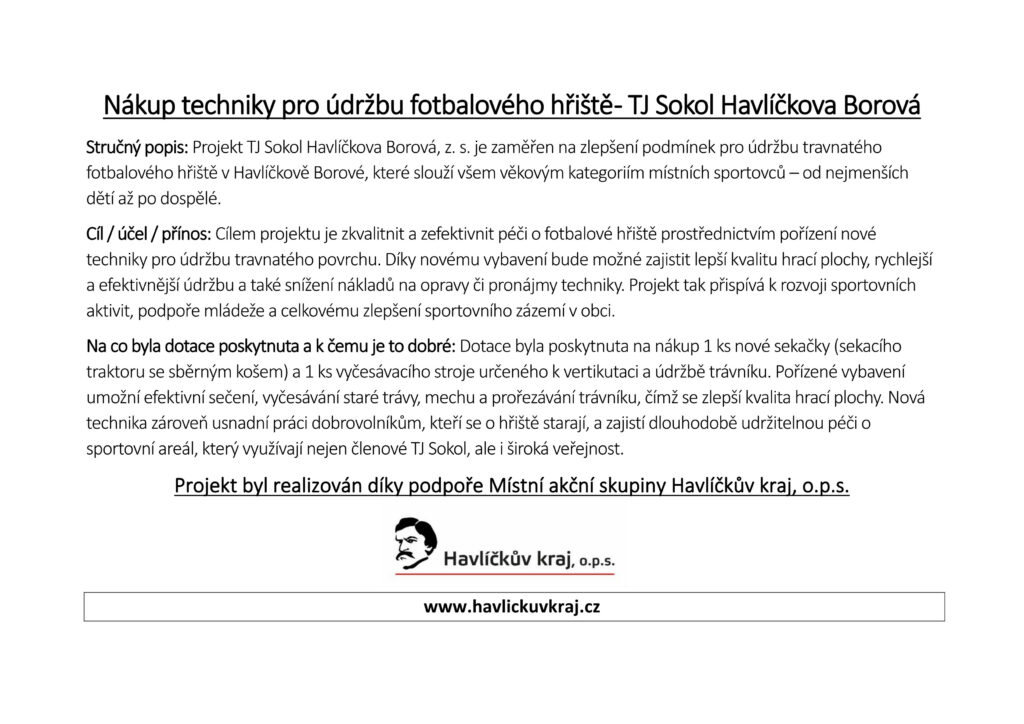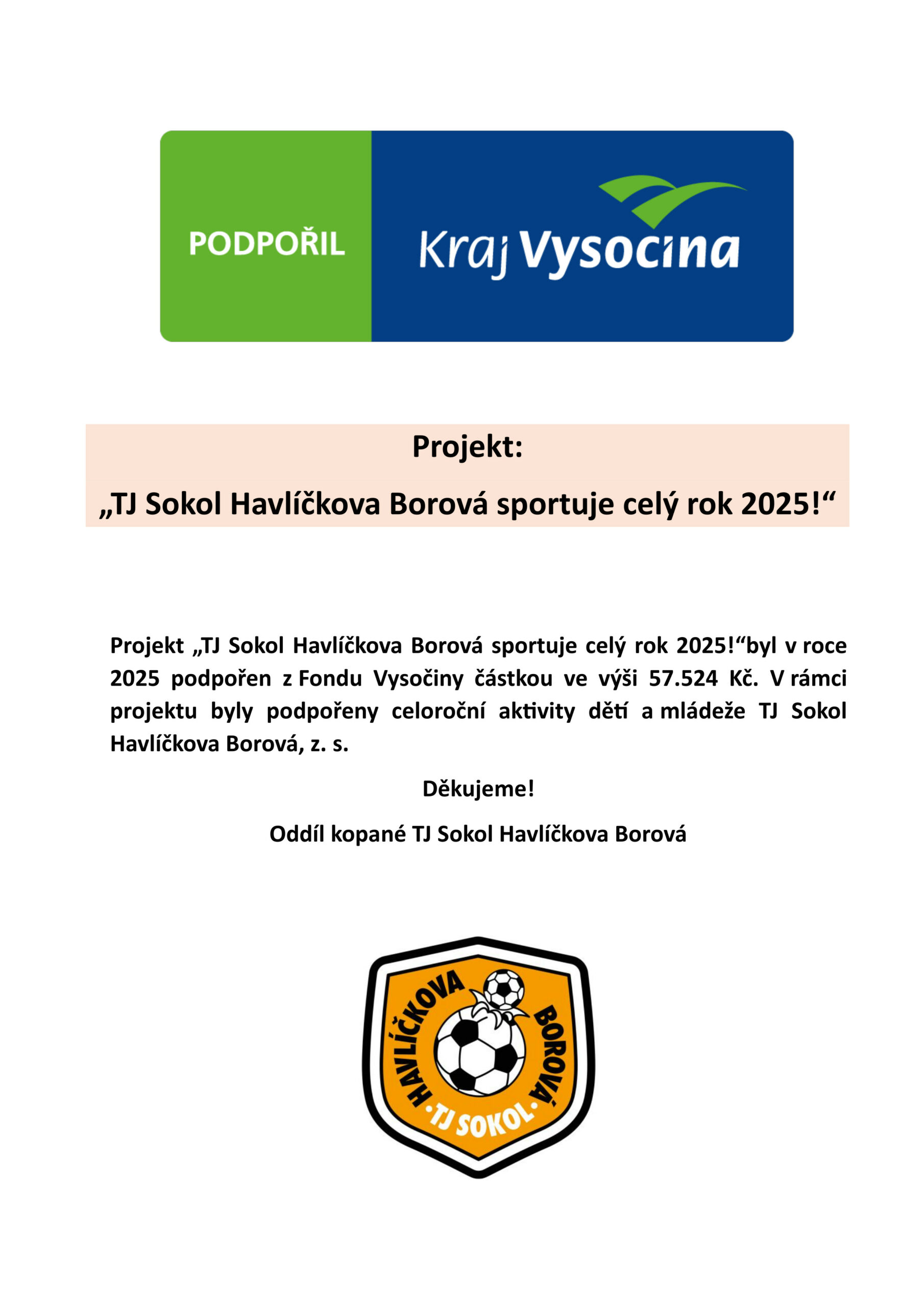 Každoročně se také snažíme žádat o finanční příspěvek na naši fotbalovou mládež Městys Havlíčkova Borová: